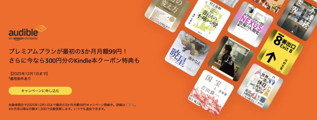 Audible(オーディブル)の「ブラックフライデー 3か月99円キャンペーン」が開催中です(2025年11月14日(金)10:30〜12月1日(月)23:59)。